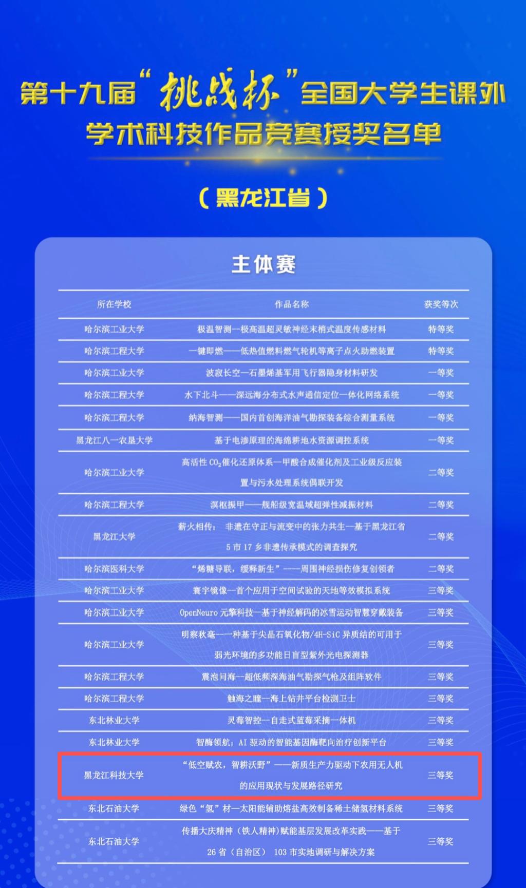 近日,由共青团中央、中国科协、教育部、中国社会科学院、中国工程院、全国学联和江苏省人民政府共同主办的第十九届“挑战杯”全国大学生课外学术科技作品竞赛在南京大学落下帷幕,由我校高太光教授指导的《“低空赋农、智耕沃野”——新质生产力驱动下农用无人机的应用现状与发展路径研究》项目荣获主体赛全国三等奖。
