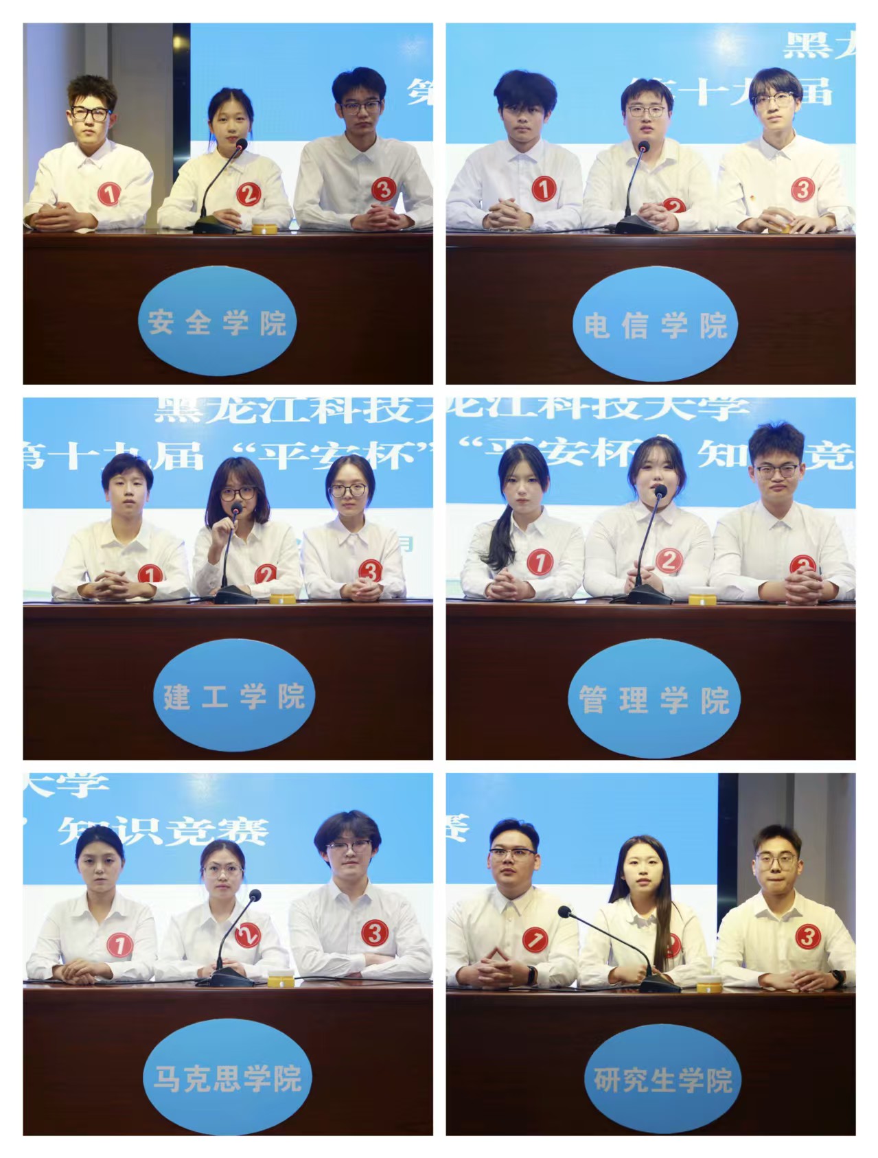 本届“平安杯”知识竞赛自10月初开赛以来,历经初赛、复赛的层层选拔,安全工程学院、电子与信息工程学院、建筑工程学院、管理学院、马克思主义学院、研究生学院6支代表队成功晋级决赛。