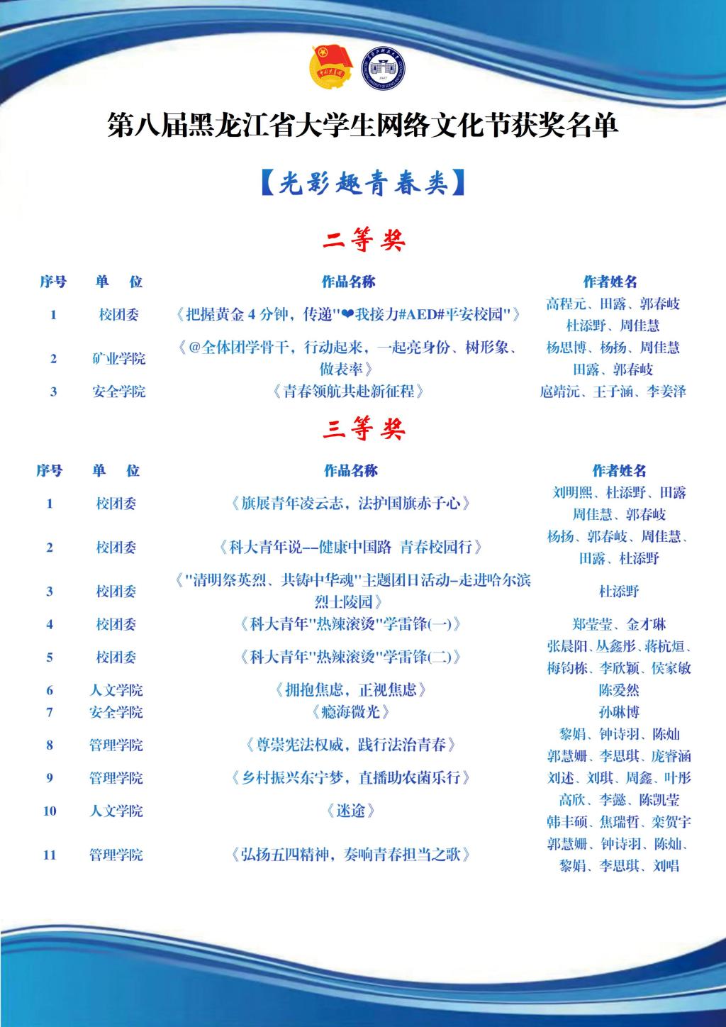 此次评选中,我校青年学生在全省大学生网络文化节的光影趣青春、影像创意汇等7个赛道中表现亮眼,共有31项作品获奖,其中,二等奖9项、三等奖22项;我校教师在全省高校网络教育优秀作品推选展示活动中成果丰硕,13项作品获奖,其中,二等奖5项、三等奖8项。获奖作品紧扣“争做校园好网民,汇聚网络正能量,奋进强国新征程”的主题,政治导向正确、内容积极向上、形式新颖多样,展现了科大青年让网络空间主旋律更加高昂、正能量更加充沛的青春风貌,凝聚了我校教师创新网络育人机制与载体,充分发挥网络文化活动滋养人心、凝聚力量的积极作用,彰显了我校网络文化建设的扎实成效与育人成果。