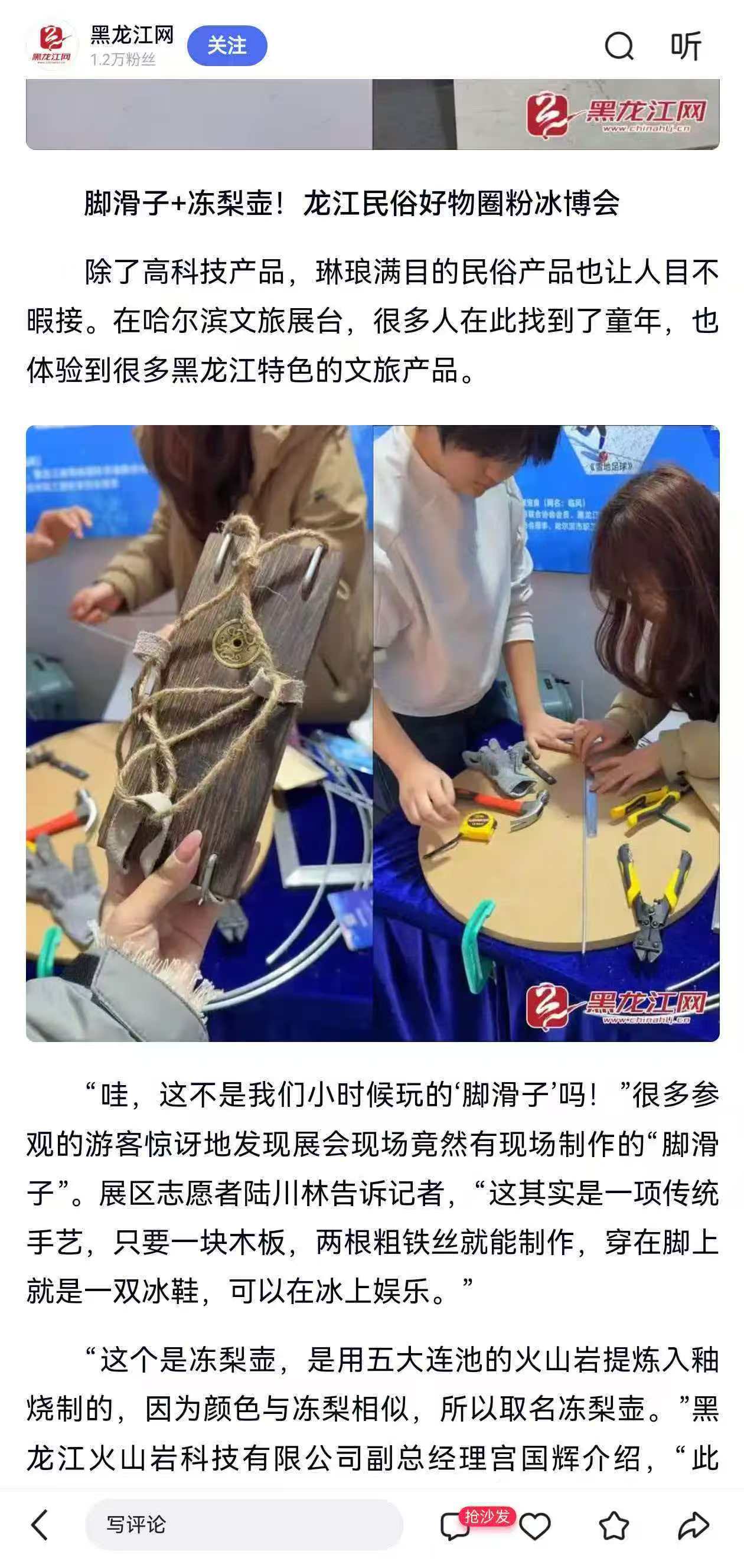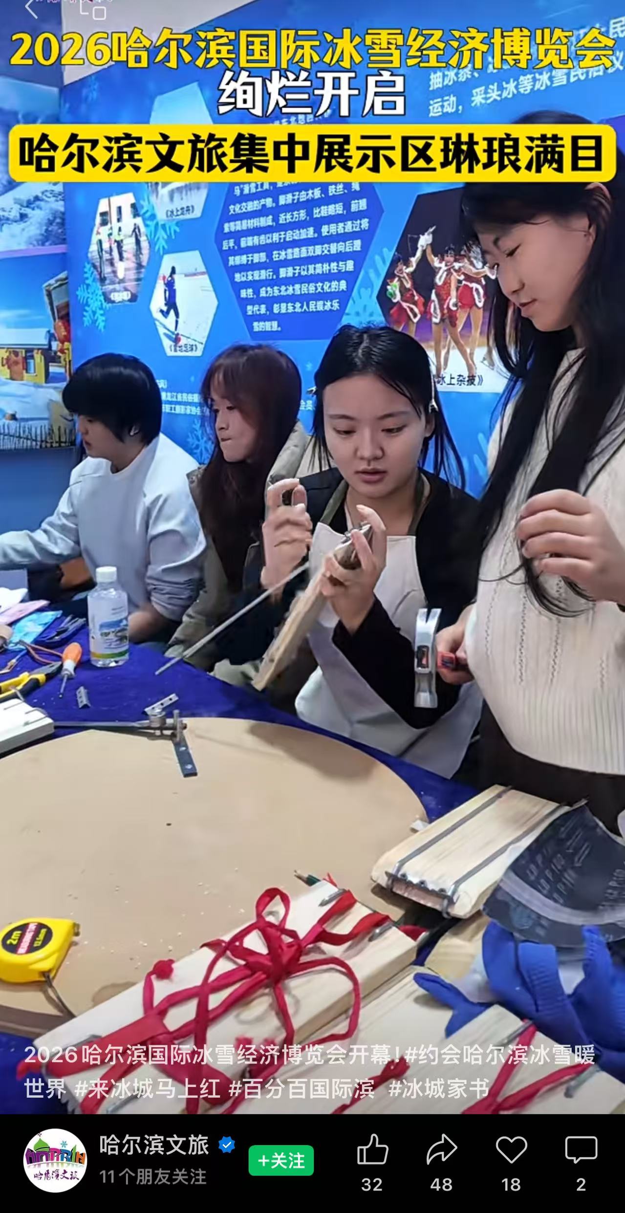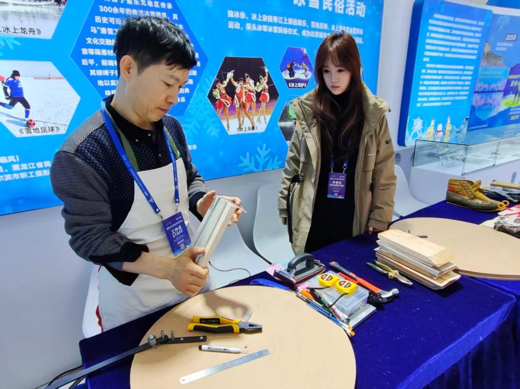 他们不仅守护着技艺的温度,更主动探索传承新路径。结合专业所长,提出“非遗+数字”创新构想,将NFC技术嵌入脚滑子,游客扫码即可观看制作技艺视频,让传统技艺与现代科技完美相融。从晨光初露到夕阳西下,4名科大学子用日均8小时的坚守,完成了百余次讲解体验、每天数十件简易脚滑子组装指导。他们的身影穿梭在展区,用最鲜活的青春力量,为这项承载着东北冰雪记忆的非遗技艺注入了新的生命力。