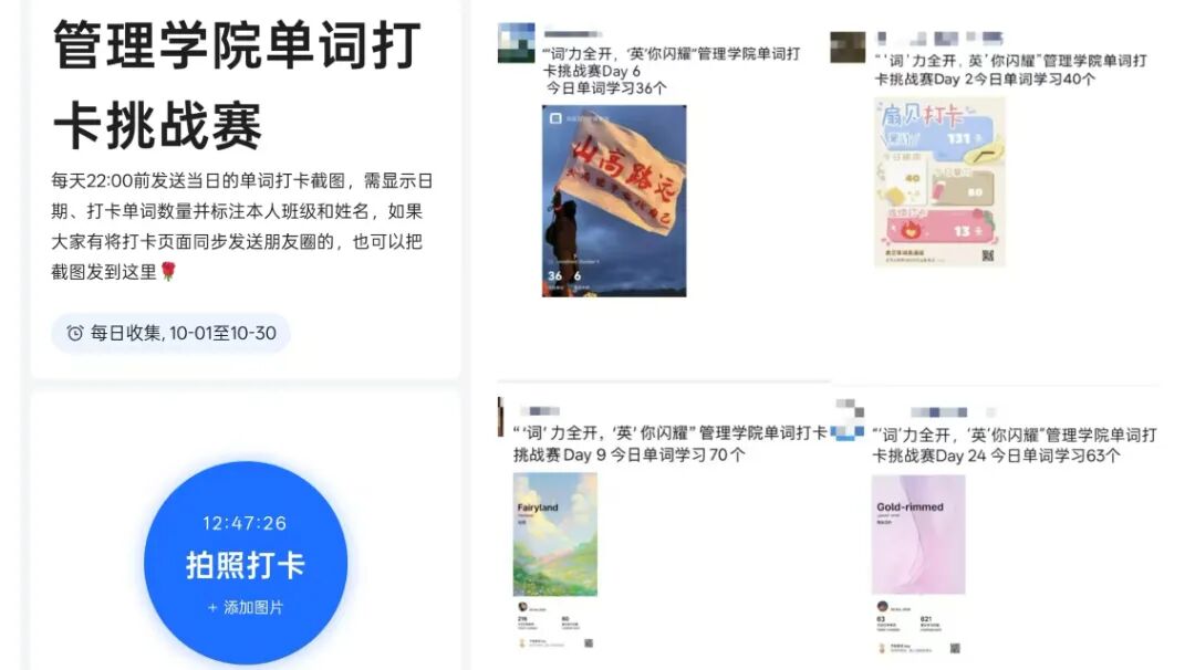 为进一步强化学风建设,激发管院学子记忆英语单词的热情,全面提升英语综合能力并培养良好的学习习惯,10月10日-11月10日,管理学院团委开展为期一个月的“词”力全开,“英”你闪耀单词打卡活动。