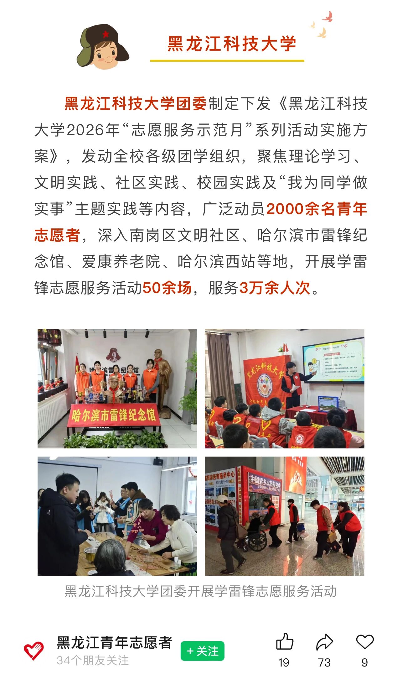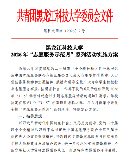 三月春风常在,雷锋精神永存。2026年志愿服务示范月既是一次雷锋精神的传承,更是一次科大青年青春行动的集结。校团委将持续以雷锋精神为引领,深耕思想引领、厚植实践沃土、健全长效机制,引导广大青年学生传承雷锋精神、践行青春担当,在志愿服务中锤炼品格、增长才干,让雷锋精神在黑科大校园落地生根、开花结果,让青春在奉献中绽放绚丽之花。