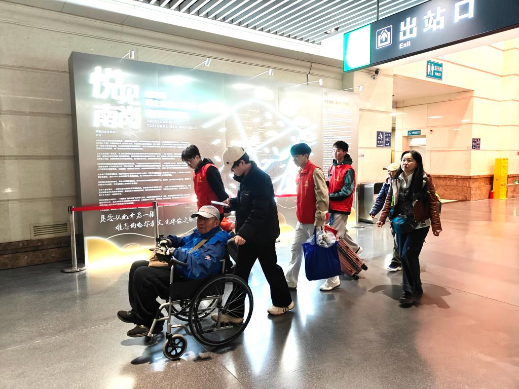 志愿者们解答来往旅客关于车次查询、换乘路线、周边交通等问题