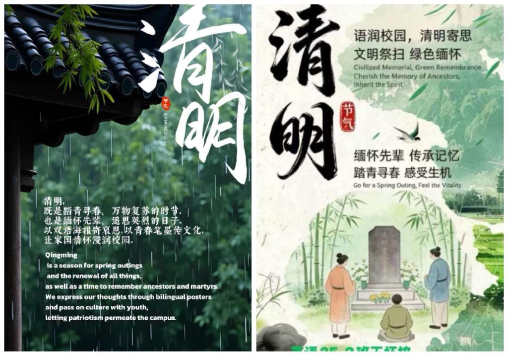 双语创佳作 海报寄哀思。学院举办双语主题创作活动,学子们绘清明画卷、制主题海报,融入英烈形象与春日氛围,用中英、中俄等语言注解,以专业能力诠释追思情怀,让红色文化焕新彩。