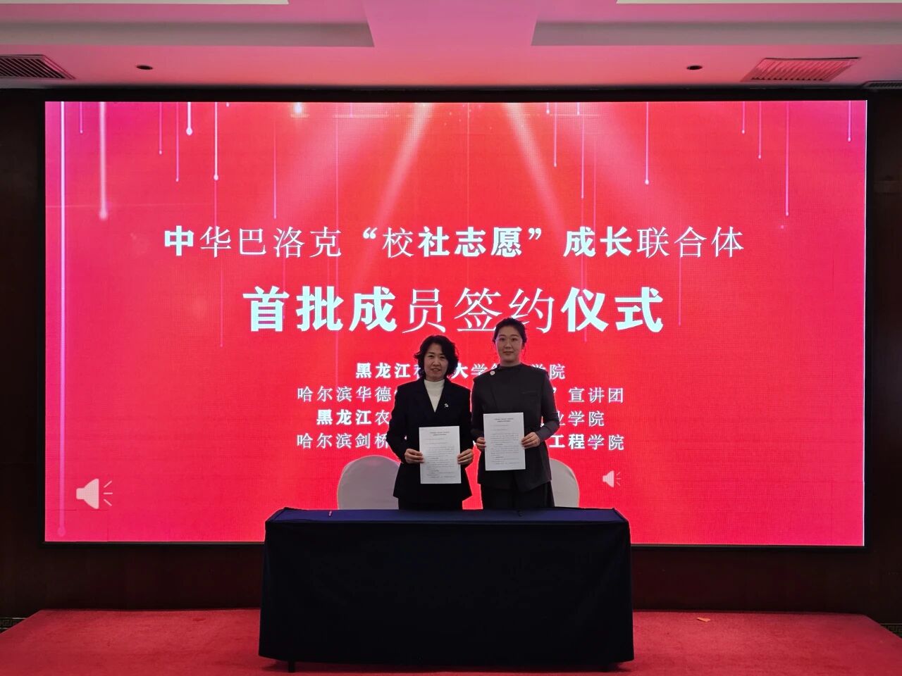 仪式上,由我院星火志愿服务队队长高艺作为志愿者代表宣读了中华巴洛克“校社志愿”成长联合体告知书,学院团委书记王紫麒与道外区志愿联合会会长吴风光现场签约,正式加入联合体成为校社志愿协同发展的重要力量。该联合体旨在以校社联动为纽带,搭建青年志愿服务实践平台,助力道外区中华巴洛克百年老街文旅事业发展。此外,服务队还为整场大会提供了细致周到的会务保障、现场引导、秩序维护及后勤服务等志愿工作,以饱满的精神风貌和务实的行动展现了青年志愿者的责任与担当。